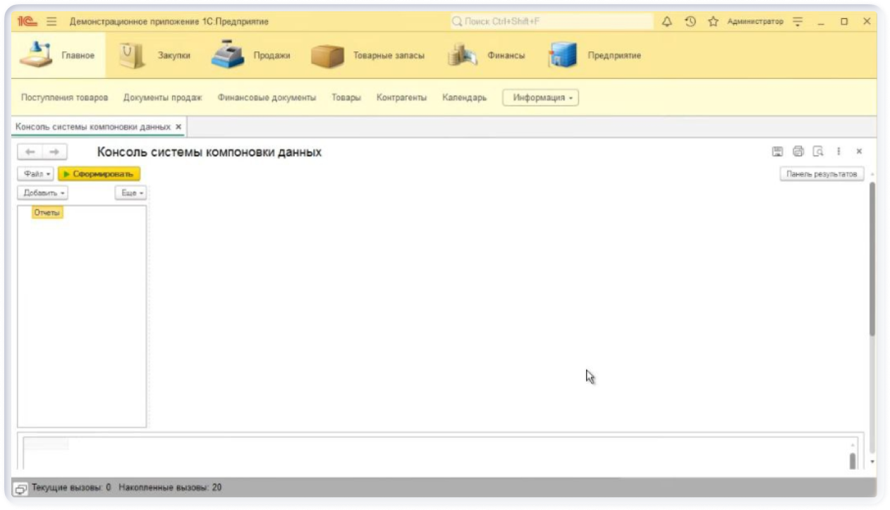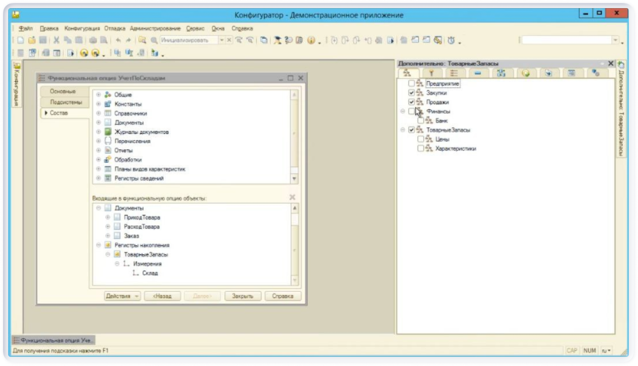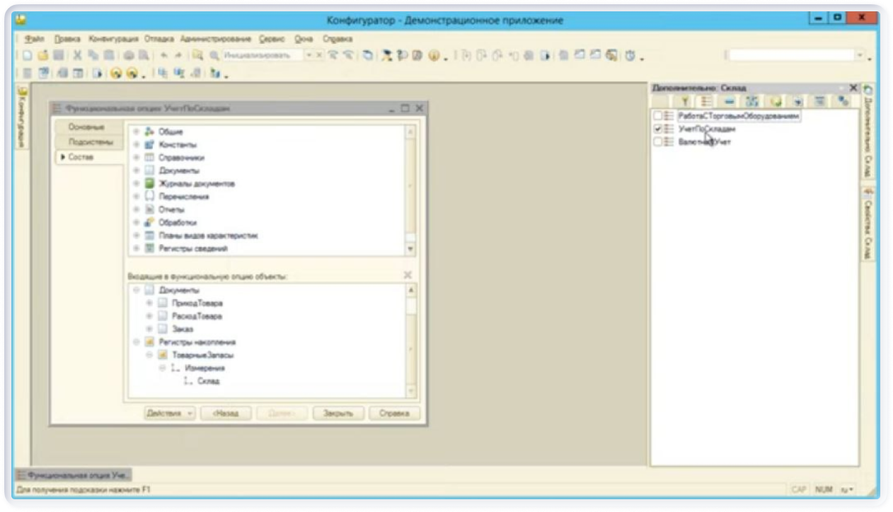 Итак, для начала мы с вами рассмотрим какие вообще функциональные опции есть в этой конфигурации. И обязательно определим на что они влияют. Для этого будем использовать в демонстрационном приложении «1С Предприятие» доработанную консоль системы компоновки данных, взятых с АТС