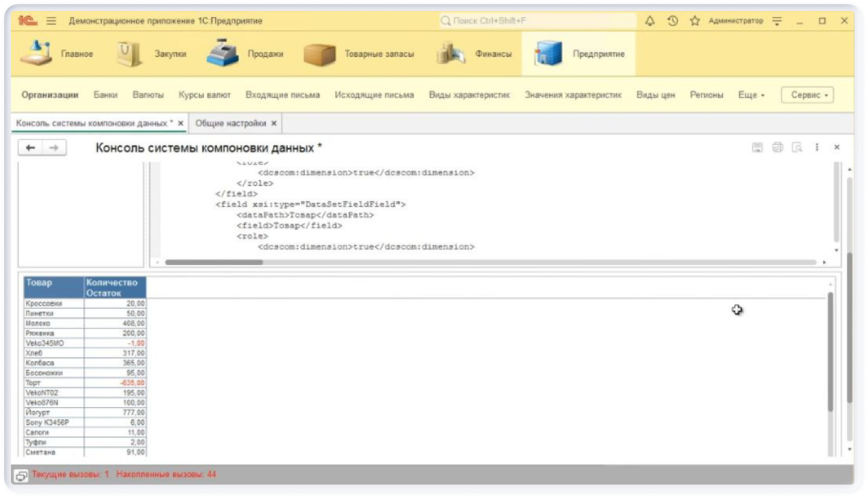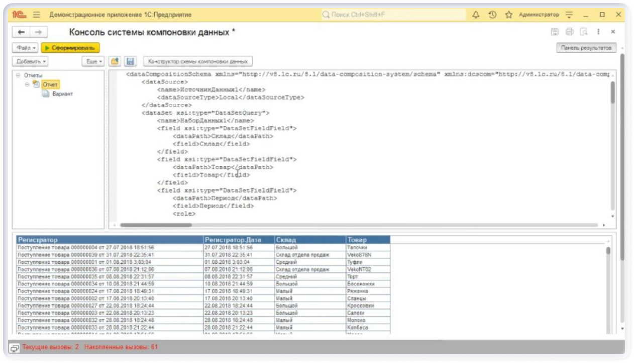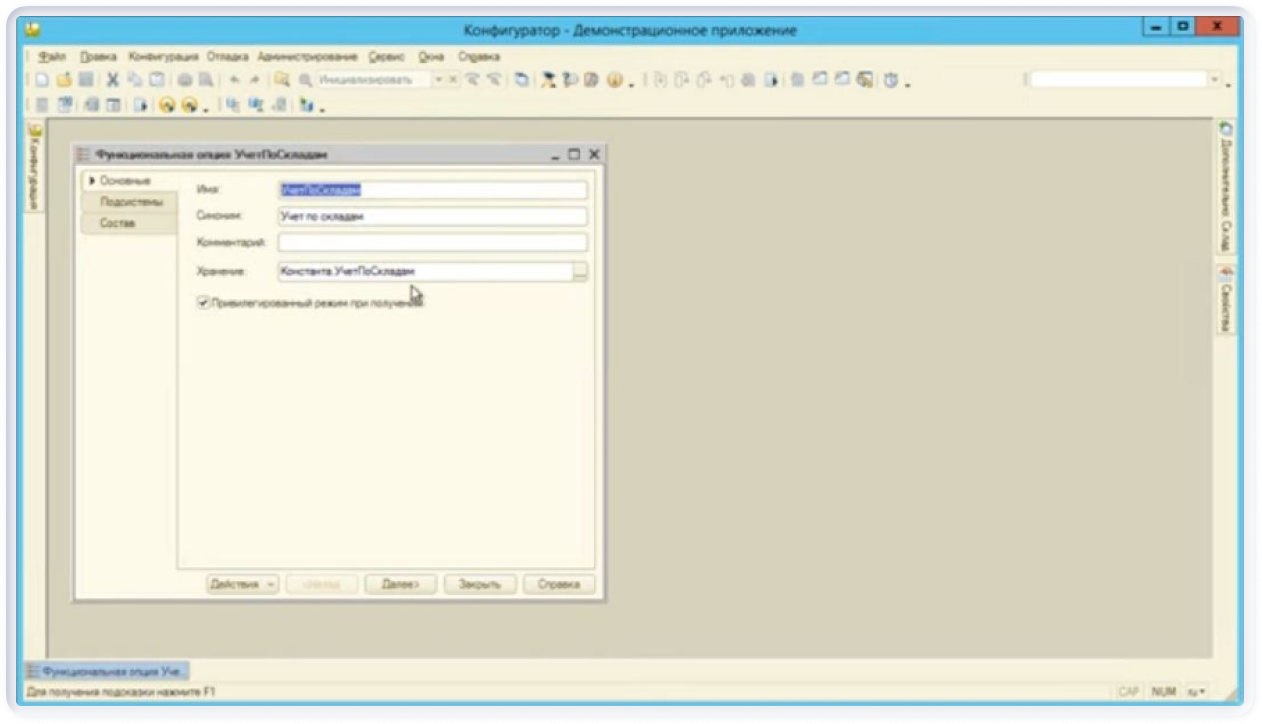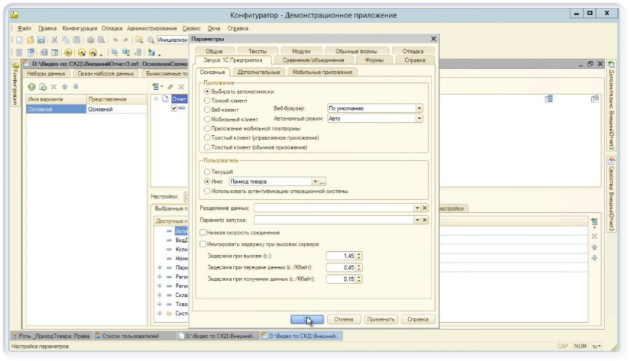 Итак, для начала мы с вами рассмотрим какие вообще функциональные опции есть в этой конфигурации. И обязательно определим на что они влияют. Для этого будем использовать в демонстрационном приложении «1С Предприятие» доработанную консоль системы компоновки данных, взятых с АТС