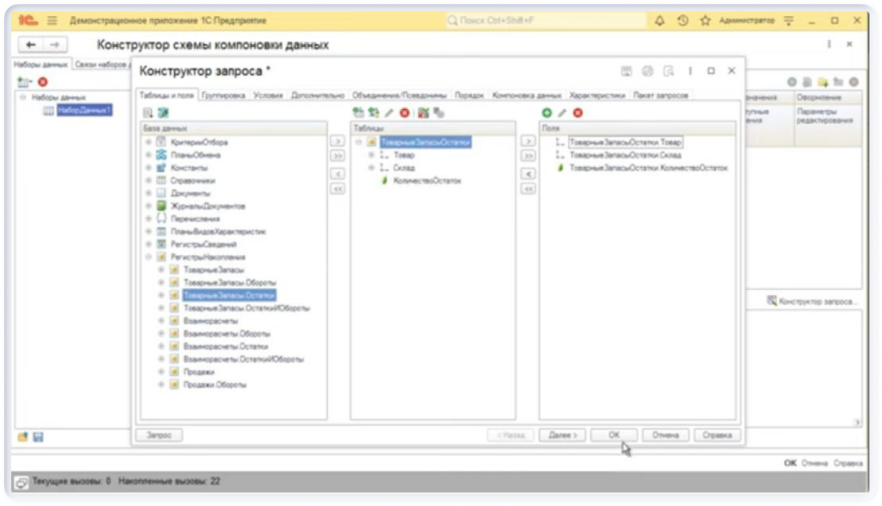 Вернемся в режим «1С Предприятие». В консоли системы компоновки данных добавим схему: в наборе данных «Запрос» выберем «Товарные запасы – Остатки» и все поля