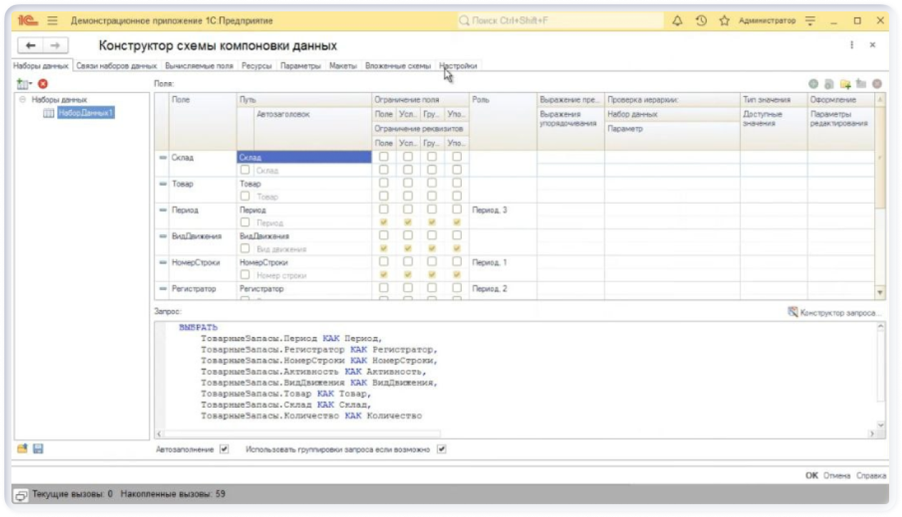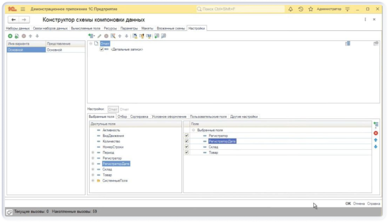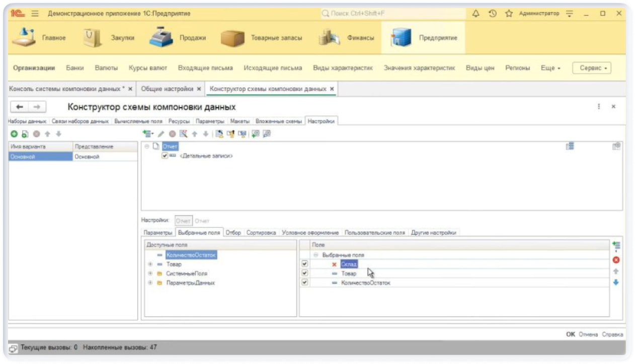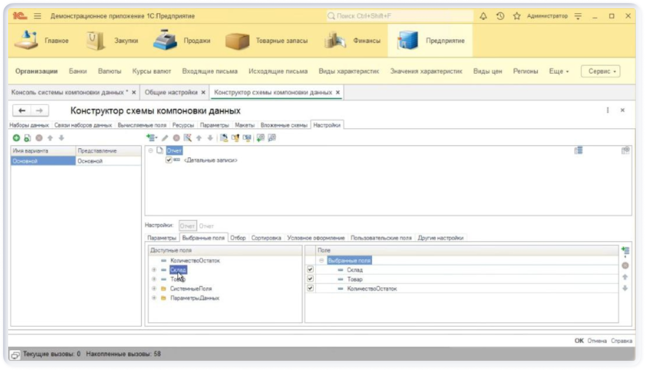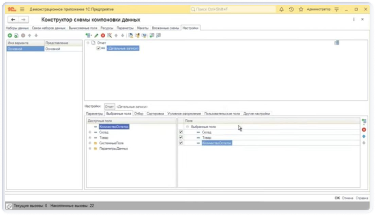 Вернувшись в настройки программы и включив функциональную опцию «Учет по складам», а также открыв конструктор схемы компоновки данных, мы увидим, что поле «Склад» появилось и в доступных полях, и в настройке полей
