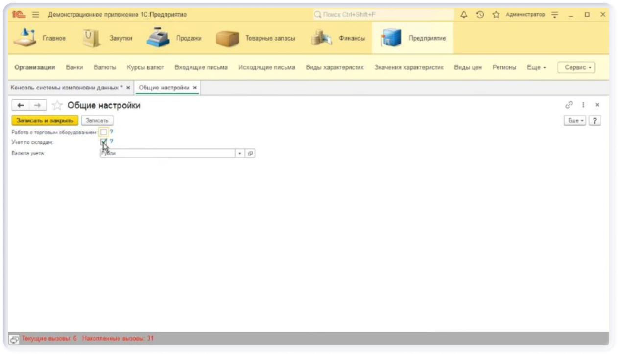 Затем в настройках базы данных отключим функциональную опцию. Для этого в общих настройках отключаем «Учет по складам»