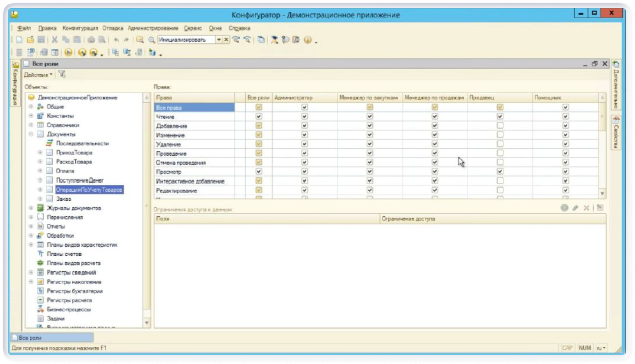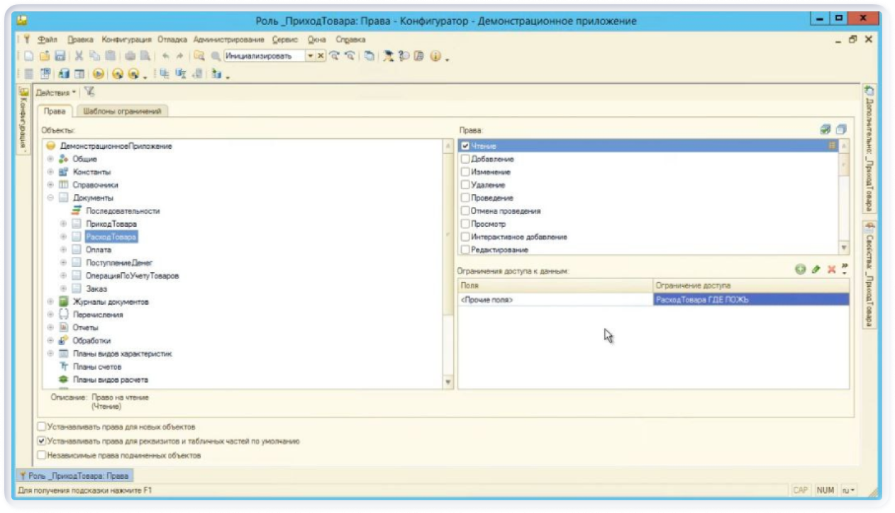 Сохраним схему в файл и перейдем в конфигуратор. Обратим внимание на все роли и проверим: есть ли у нас в системе роль, которая ограничивает пользователя в чтении документа движения товаров («Приход товара», «Расход товара», «Операция по учету товара»). Как видно, все роли предоставляют хотя бы право на чтение либо на просмотр