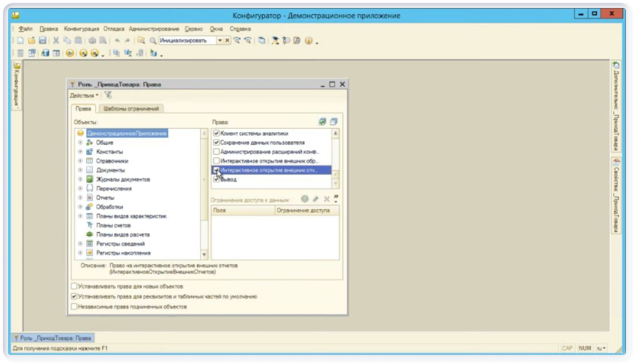 Создадим новую роль «Приход товара» (демо) и дадим право администрирования, чтобы работала консоль СКД, также право запуска «Толстый клиент» и «Интерактивное открытие внешних отчетов», поскольку мы будем создавать внешний отчет, надо иметь право его открывать