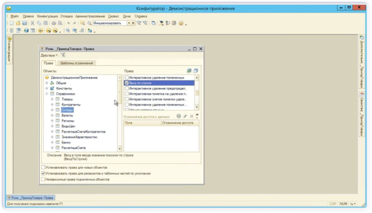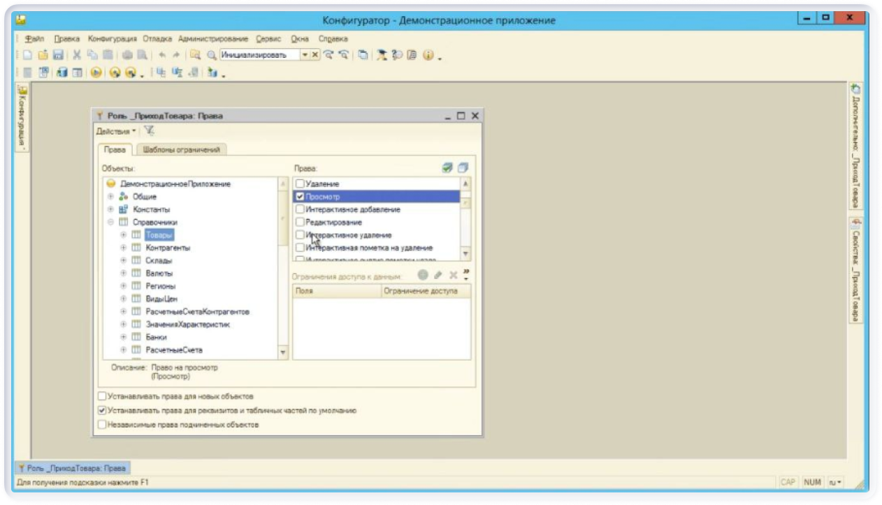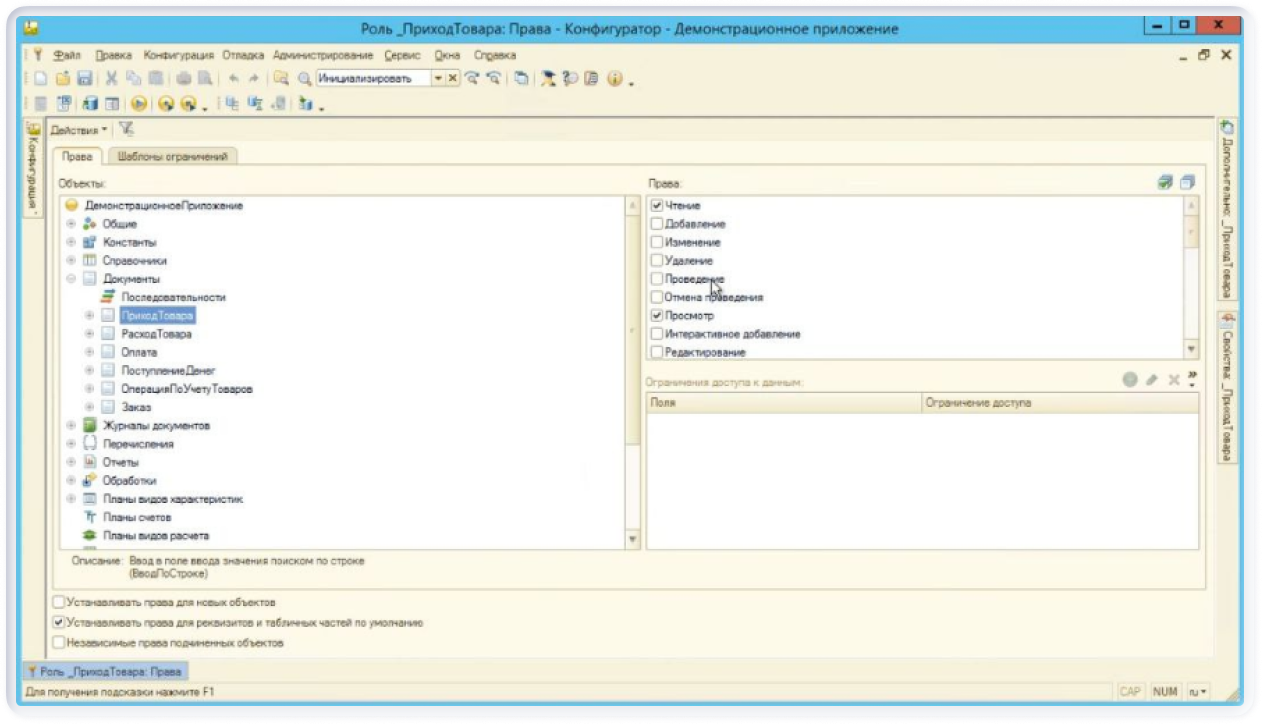 В справочнике «Приход товара» устанавливаем полные права на «Чтение» и «Просмотр»