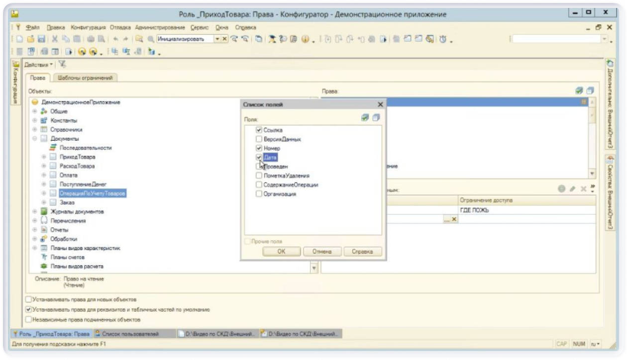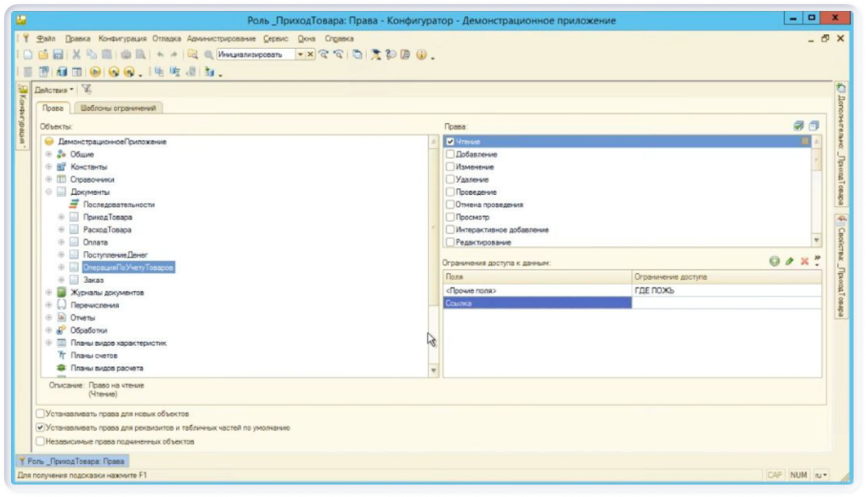Для документа операция для учета товаров предоставим право на «Чтение». Для ограничения доступа укажем условие «ГДЕ ЛОЖЬ», а в поля добавим только поле «Ссылка»