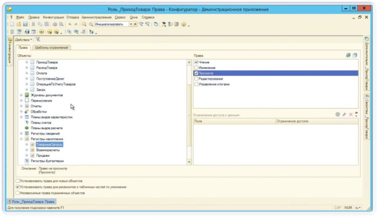 В регистре «Товарные запасы» добавим права на «Чтение» и «Просмотр»