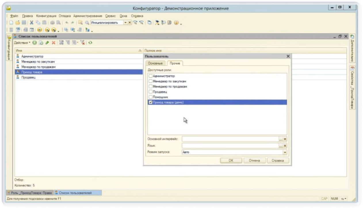 Обновим конфигурацию базы данных и добавим пользователя «Приход товара», отключим защиту от опасных действий (она не понадобится). Затем назначим ему роль «Приход товара» (демо), которую мы только что создали