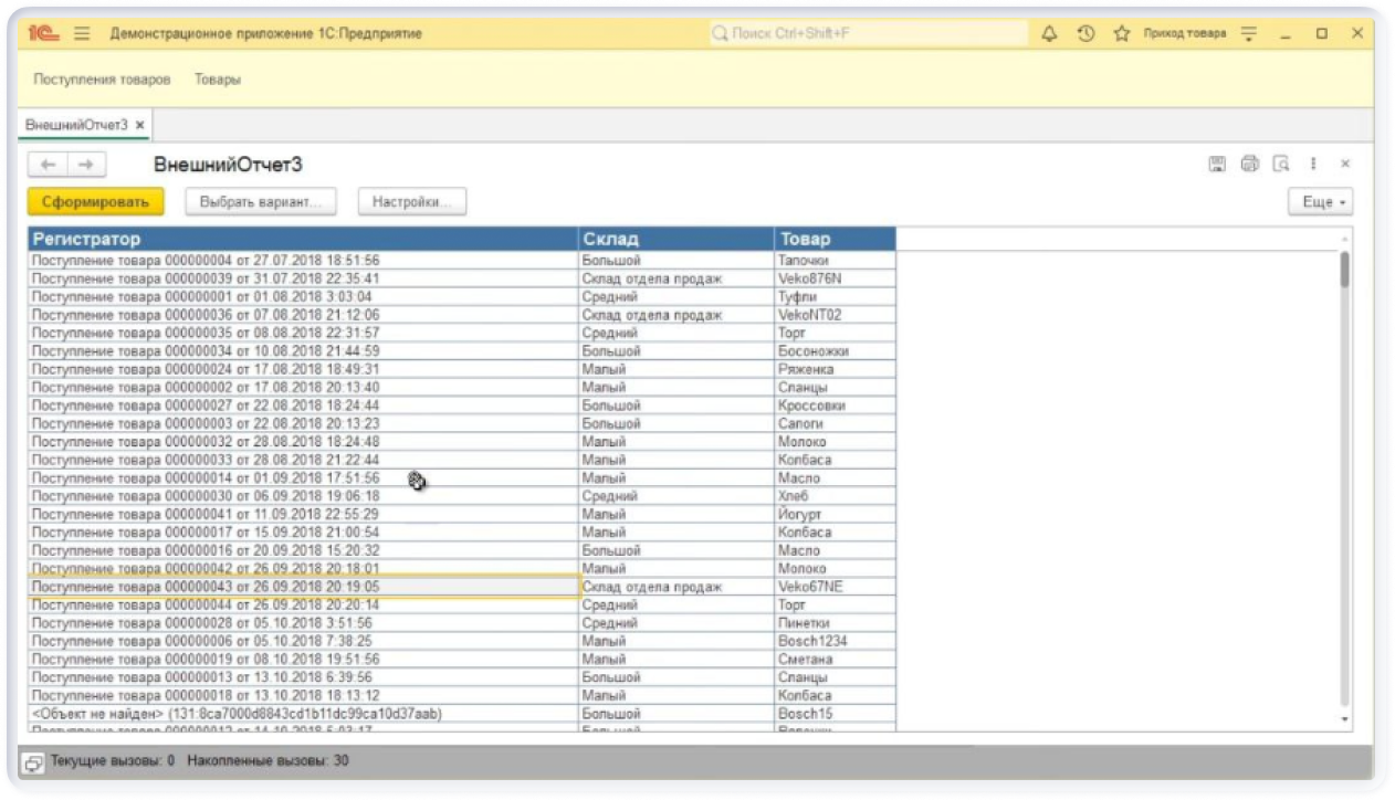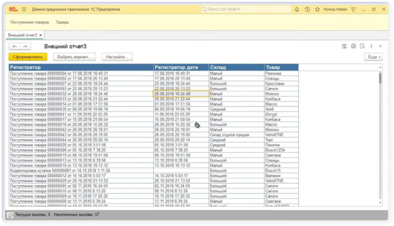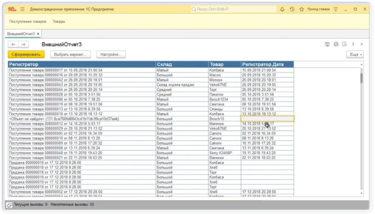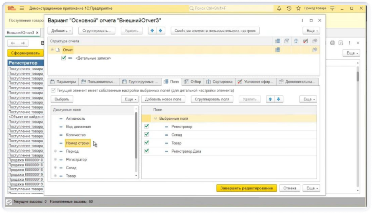 Для этого обновим конфигурацию базы данных и зайдем в режиме «Толстый клиент». Сформируем «Внешний отчет 3». И видим что поле «Регистратор. Дата» доступно среди выбранных полей. Причем это поле отображает только дату документа поступления товара