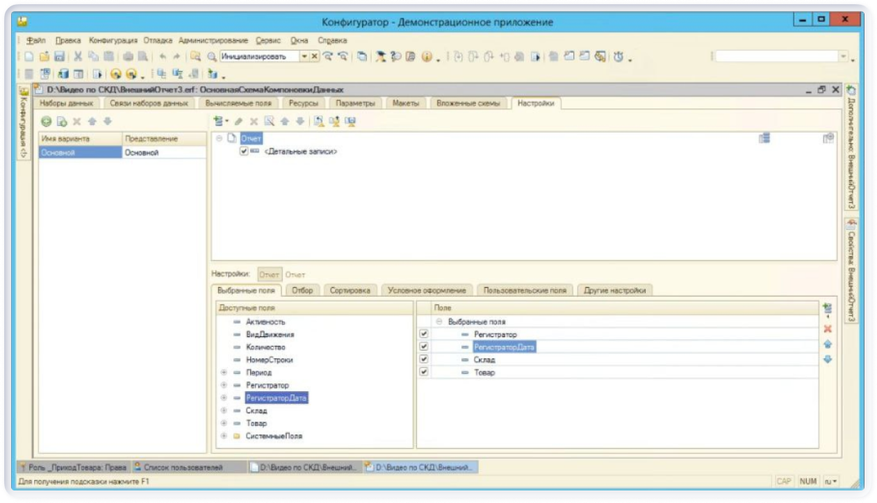 Вернемся в конфигуратор в конструктор схемы и проверим какие здесь есть настройки . В настройке «Выбранные поля» добавим поле «Регистратор. Дата» и оно также доступно среди выбранных полей. В параметре «Расположение реквизитов» выбираем значение «Отдельно».