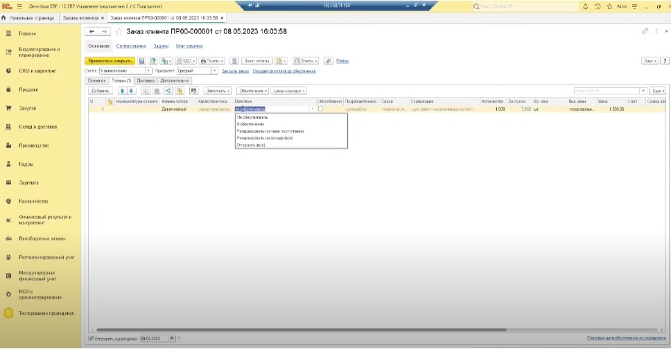 ● «Не обеспечивать» — данное действие используется, если нет необходимости фиксировать потребности и предварительно резервировать товар на складе до его отгрузки.