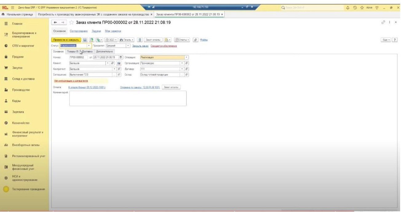 Заполним организацию и проведем заказ на производство. Теперь нам необходимо произвести заказ.