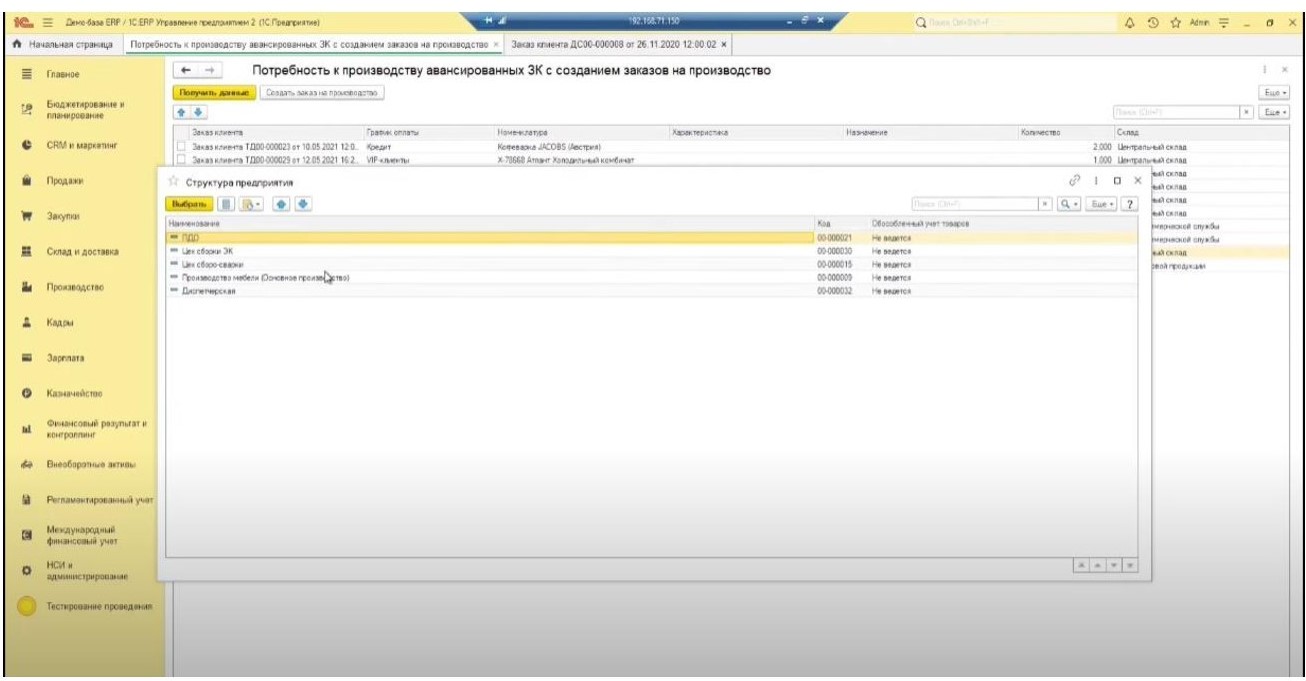 ● Возможность выбора подразделений необходимо реализовать в момент создания заказа на производство.