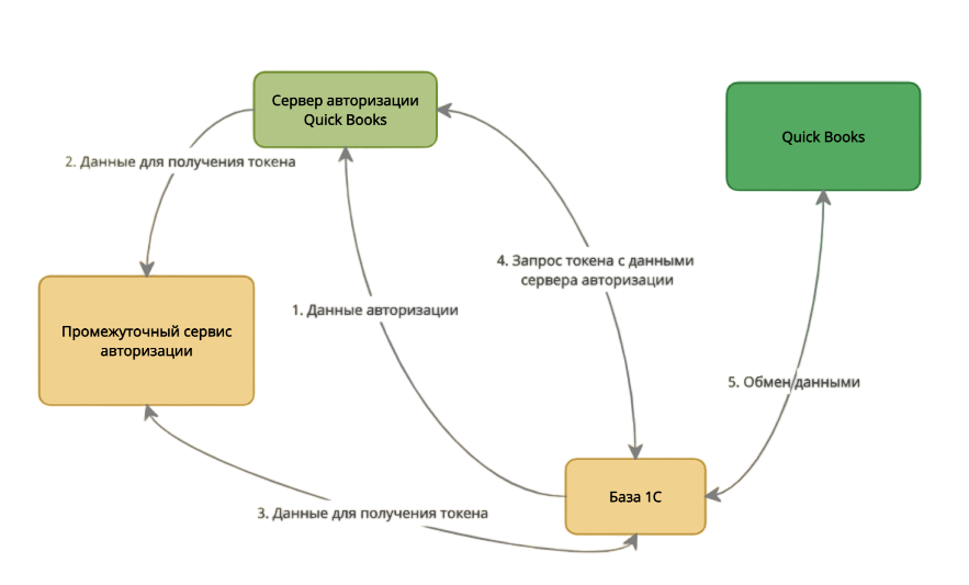 Трудность состояла в том, что для 1С не было инструментов быстрой интеграции с QuickBooks. Кроме того, для подключения к внешним сервисам QuickBooks требовалось пройти OAuth 2.0 авторизацию, а для этого нужно было из QuickBooks в 1С получить код для генерации токена и сам токен. Чтобы QuickBooks предоставил эти данные, требовался внешний IP-адрес, которого у локально установленной 1С могло не быть: не каждый заказчик может позволить себе статичный IP и обслуживание веб-сервера. Чтобы получить универсальное решение, мы разработали промежуточный сервис, который забирает необходимые данные авторизации от QuickBooks, а потом передает их в 1С. Веб-сервер и сам сервис разместили на отдельной рабочей станции.