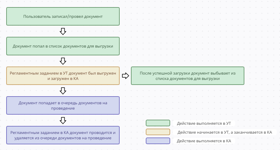 - Дополнительно в базе КА был добавлен регистр сведений, который хранит в себе очередь документов на проведение, которые были загружены из УТ. Это было сделано из-за того, что документы обычно имеют свои цепочки, которые должны проводиться в определенном порядке. К регистру было добавлено регламентное задание, которое по расписанию проводит все документы по списку. Оптимальное время для работы задания — 0,5–1 час.