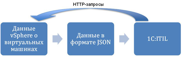 ♦ Разработать механизм обмена данными между 1С:ITIL и внешней ПО по производственным мощностям VMware vSphere, позволяющий загружать в 1С информацию по активам и их производительности: