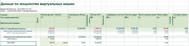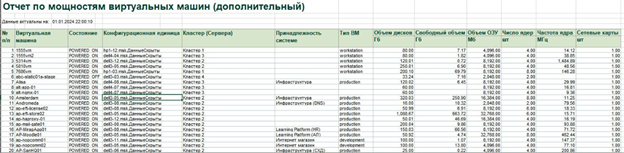 Например, отчет «Данные по мощностям виртуальных машин» позволяет сопоставить параметры производительности физического сервера и отобразить их разницу с суммой данных о производительности размещенных на нем виртуальных машин.